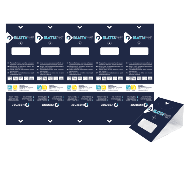 PN-Blatta Trap 5/1 es una trampa adhesiva para el control de insectos rastreros, preactivada con una mezcla de aromas alimentarios sin alƩrgenos. La lƔmina entera se puede dividir en hasta 5 trampas individuales.