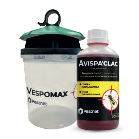 Solución especĆfica para capturar avispas y avispones. Formada de una trampa de plĆ”stico (Vespomax Trampa) y de un atrayente lĆquido concentrado (Avispa’clac), basado en componentes de origen natural. Contiene un agente estabilizador de los agentes tensio-activos, que facilitan el ahogamiento de los insectos atrapados. Avispas y avispones entrarĆ”n en la trampa, atraĆdas por el atrayente y morirĆ”n ahogadas. Inodoro y de efecto inmediato a cualquier temperatura. Es eficaz durante 10-12 dĆas. Es efectivo tambiĆ©n contra la avispa asiĆ”tica.